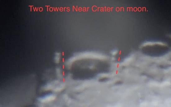Астроном обнаружил две лунные башни на краю кратера . Луна имеет много разнообразных артефактов, происхождение которых ученые затрудняются объяснить. Многие из этих объектов трудно увидеть, если у вас нет инфракрасной камеры. В Вашингтоне 21 марта 1996 г. Национальный пресс-клуб США опубликовал заявление , которое содержало следующие строки :