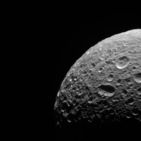 Камеры космического аппарата "Кассини" сфотографировали область северного полюса Мимаса с расстояния 50 000 километров от его поверхности. Фотография была сделана 5 июня 2012 года.