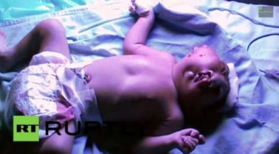 Более того, ребенок, судя по видео, также является анэнцефалом (отсутствуют большие полушария мозга и часть костей черепа). Хотя ребенок жив, его состояние оценивают как очень тяжелое.