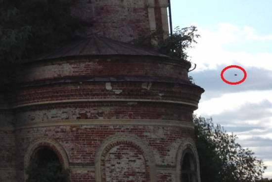 Снимок был сделан 27 июля в дер. Пальник Куменского района. Фотографируя местную разрушенную церковь, очевидец не обратил внимания на небольшой черный предмет в небе. Черную точку можно было принять за птицу или просто погрешность объектива.