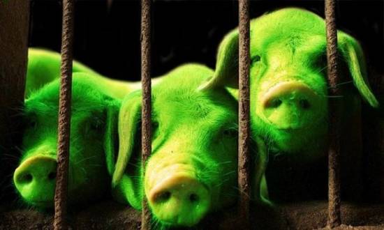 Перед Новым годом ученые из Китая создали зеленоватых поросят, которые излучают зеленый свет в темноте.