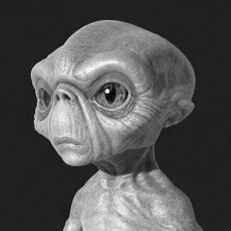 Кисти рук пришельца представляли собой три или четыре (он плохо разглядел) какие-то членисто-сегментные розово-красного цвета пальцы. Лицо существа было круглое, рот и нос не просматривались. Зато на нем выделялись огромные, светящиеся зеленым светом глаза. Они не имели ни зрачков, ни ресниц.