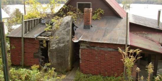 Viskonsino valstijoje (JAV) stovi unikalus pastatas, kurio aplankyti kasmet užsuka dešimtys tūkstančių turistų. Šis turistiniu objektu paverstas gyvenamasis namas vadinamas "Rock in the House" ("Akmuo name"). Į jį pataikiusio ir miegamajame sustojusio 55 tonų akmens niekas nebejudino – jis taip čia ir slūgso nuo 1995 m. Neįtikėtina, tačiau LYGIAI Į TĄ PAČIĄ VIETĄ riedulys atrieda nebe pirmą kartą. Pasirodo, 1901 m. irgi į miegamąjį atlėkė ir ten miegojusią namo šeimininkę užmušė kitas milžiniškas akmuo.