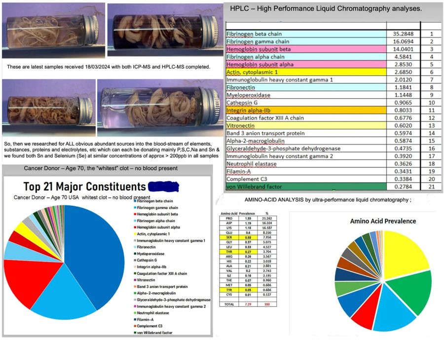 Thefocalpoints.com сообщает: Чтобы лучше понять, из чего они состоят, он объединился с Грегом Харрисоном, промышленным органическим химиком с глубокими знаниями в области анализа полимеров. Харрисон подверг сгустки тщательным биохимическим испытаниям с использованием таких методов, как ICP-MS, HPLC, рамановская спектроскопия и RT-QuIC.