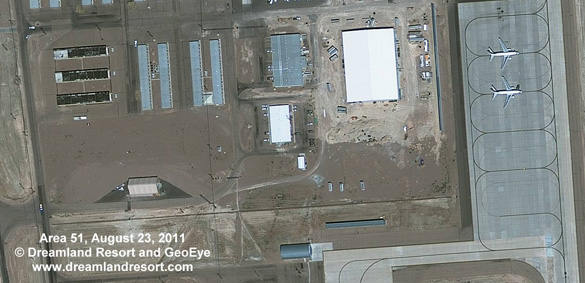 Janet airliners (upper right) seen in satellite image of Area 51. (Credit: Dreamland Resport and GeoEye)