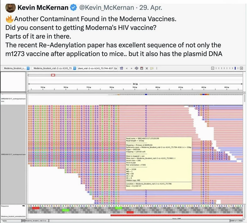 Среди миллионов последовательностей РНК вакцинированных мышей он обнаружил не только ожидаемый код белка-шипа COVID, но и фрагменты так называемого gp145 — гена из экспериментальной вакцины Moderna против ВИЧ.