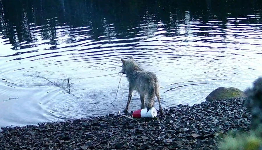 Ловушки стояли в том числе и в глубоких местах, где они постоянно находились под водой, поэтому ученые были уверены — это дело морских млекопитающих. Но уже через сутки камеры зафиксировали невероятное: волк выплывает из воды с буйком в пасти, кладет его на берег, хватает веревку зубами и тянет ловушку на мелководье, после чего съедает приманку.