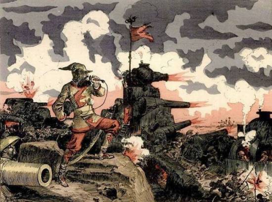 Это замечание показалось Альберу не лишённым глубокого смысла, и скоро он сделал символический рисунок: огромный рыцарь с длинным копьём, в прочных доспехах, на сильном и красивом коне невольно пятится от надвигающегося на него паровоза — символа эпохи пара.