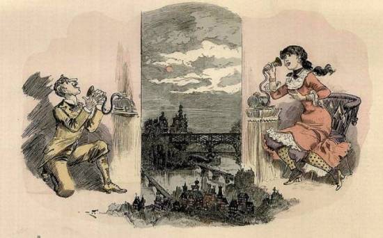Попутно Робида собирал исторические сведения, предания, народные песни, шутки и рисовал, рисовал без устали. Однажды он нарисовал небольшую группу французских рабочих, занятых на строительстве новой железной дороги. Они, примостившись на шпалах, собрались перекусить. Один из рабочих, разливая вино, указал на стоящий вдали локомотив с длинной дымящейся трубой: