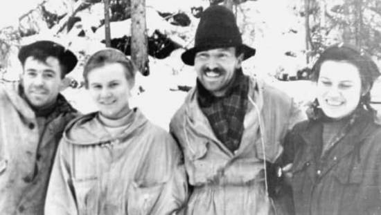 Выживший Юрий Юдин обнимается с Людмилой Дубининой. Сзади стоит Игорь Дятлов