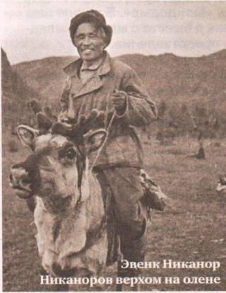 Вечером наша комиссия, возвратившись с места гибели людей, расположилась у костра. Вдруг наши собаки залаяли и бросились в лес. Мы насторожились. Лай смолк, и из-за деревьев показался верхом на олене наш каюр (погонщик запряженных в нарты собак или оленей.) - эвенк Никанор Никаноров. Он работал в одной из наших бригад и приехал за продуктами. Узнав о трагедии, он однозначно заявил: