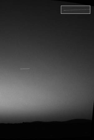 В марте 2004 года в попытке сфотографировать Землю с Марса робот "Спирит", прибывший в район кратера Гусева, поймал в объективы сразу двух камер - панорамной и навигационной - некую аномалию. И тоже в небе. На снимке она предстала в виде яркой полоски. Такой эффект возникает, когда камера снимает движущийся объект с большой выдержкой. Пока открыт затвор камеры, объект пролетает некоторое расстояние. И проявляется в виде полоски.