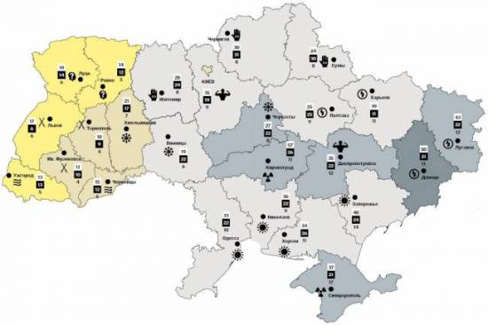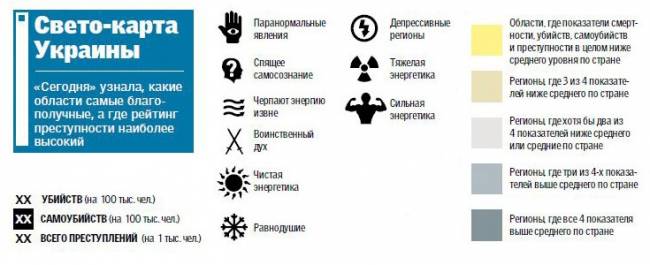 Кроме того, мы выяснили, в каких регионах выше всего смертность, преступность в целом, число убийств и самоубийств. К примеру, лидеры по уровню смертности в этом году — Сумская, Черниговская, Донецкая, Харьковская, Полтавская, Черкасская, Черниговская, Хмельницкая, Винницкая, Киевская и Житомирская области, а меньше умирали — в Ровенской, Волынской, Одесской, Закарпатской областях и Крыму (данные Госкомстата) (остальные данные см. в инфографике). Таким образом, сведя и проанализировав все цифры, мы составили карту «темной» и «светлой» Украины.