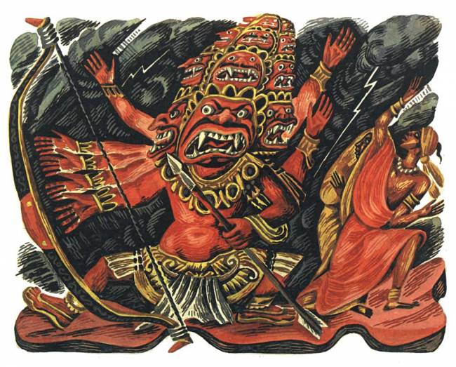 И вдруг сверкнула ослепительная молния, раздался оглушительный гром, все вокруг потемнело, и перед принцессой предстал ужасный ракшас - шестирукий демон-людоед. Он давно хотел завладеть Амалой и утащить ее в свое логово в глубине Гималаев. Со злобным хохотом ракшас бросился к принцессе, свирепо сверкая огненными глазами и размахивая могучими ручищами с большими острыми когтями. Воины попытались было встать на защиту - но где там! Ракшас дунул на них изо всех сил, из его пасти вырвался огненный вихрь - и все сопровождавшие Амалу попадали замертво.