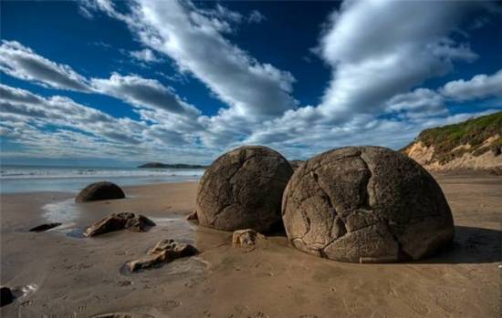 Мощный прибой Касатки, шутя, словно играя мячами, выталкивает тяжёлые камни из ледяной воды. Их форма - от яйца до правильного шара. Средняя длина валуна - полметра, но есть и более значительные. Крупные шары весят 600 - 700 кг, а камни побольше - многие тонны. Они под гнётом своей огромной тяжести намертво вошли в землю, и никаким волнам их не столкнуть.