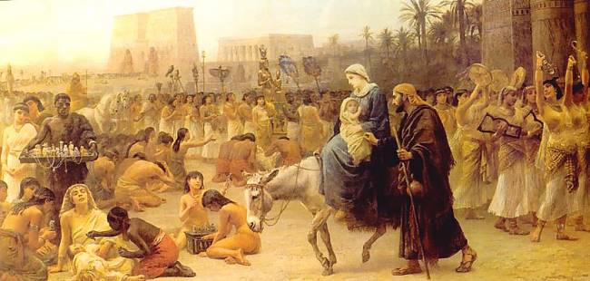 3. Евангелист Матфей пишет о бегстве Святого Семейства в Египет из-за угрозы со стороны Ирода (2.1). Этот сюжет многократно обыгрывали в христианском искусстве. На окраине Каира стоит древнейший христианский храм, возведённый якобы на том месте, где находился дом, в котором проживало Святое Семейство во время пребывания в Египте. (О бегстве Святого Семейства в Египет сообщает и римский писатель Цельс.) Далее Матфей пишет, что ангел передал Иосифу известие о том, что Ирод умер и можно возвращаться в Палестину (2.20).