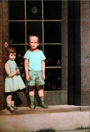 Как и на старой фотографии, дети стоят около стеклянной двери, однако на картине царит ночь — сквозь дверь видна луна. Дверь закрыта наглухо, а на фоне ночного неба светлым пятном выделяются чьи-то руки, которые стремятся открыть дверь и впустить из сада в комнату Нечто. Однако дети не взволнованы, не напуганы. Их позы расслабленны. Словно темная атмосфера мистической ночи —их привычная среда.