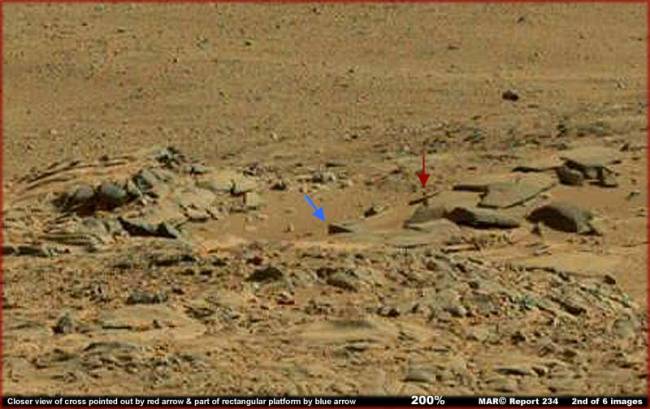 Крест образован отнюдь не узором на поверхности - он явно торчит. А наличие рядом плиты наводит на мысль, что "Любопытство", возможно, доехал до местного кладбища. Но кто тут похоронен? Вряд ли, что коренные марсиане. Ведь если верить ученым, то жизнь на Красной планете, если и была, то погибла миллиарды лет назад. От нее не могло сохраниться ничего материального. Получается, что Марс кто-то посещал. Не так давно и весьма активно.