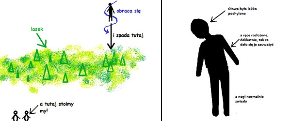 "Я живу поблизости от небольшого лесного массива. В тот день, во время работ по хозяйству, мы заметили на небе "что-то" напоминающее человека (оно имело такие же голову и конечности). Оно летело, а точнее падало, очень-очень медленно опускаясь на землю без всякого парашюта. При этом оно также медленно вращалось вокруг своей оси.