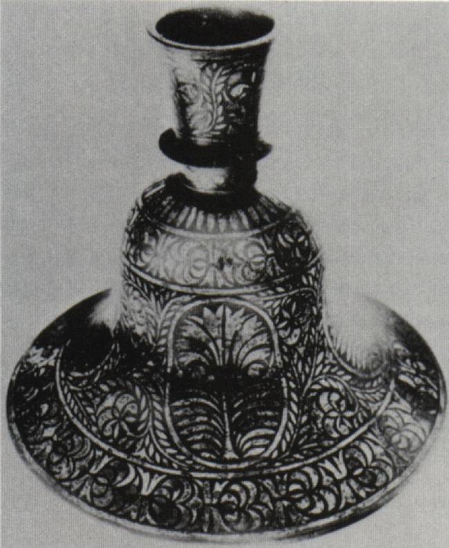 Сосуд имеет сходство по цвету с цинком или с металлом, в состав которого входит значительная часть серебра. По сторонам нанесено шесть изображений цветов или букетов, прекрасно инкрустированных чистым серебром, а вокруг нижней части сосуда изображена виноградная лоза или венок, также инкрустированный серебром. Гравировка, резная работа и инкрустация изысканно выполнены каким-то искусным ремесленником.