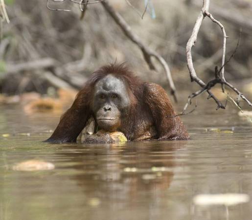 И вот служащие центра заметили, что поселившиеся в окрестностях орангутаны стали купаться. То есть, охотно плавают, ныряют в свое удовольствие. И даже пытаются добывать из реки пропитание.