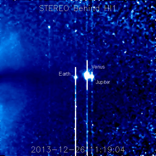 Как сейчас видно на изображении STEREO –B, космического корабля НАСА, три планеты Венера, Земля и Юпитер сгруппированы по кругу размером едва ли не 2 градуса. Космический аппарат Heliospheric Imager сделал этот снимок 26 декабря: