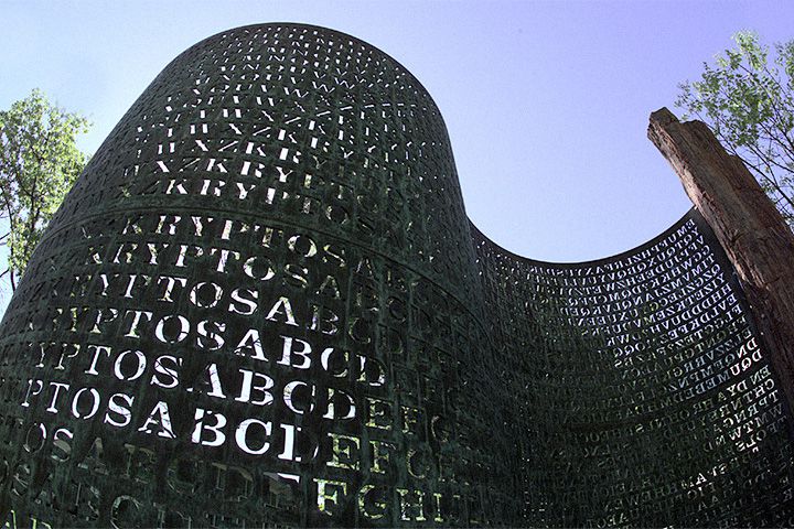 В 1990 году во внутреннем дворе штаб-квартиры ЦРУ установили изогнутый бронзовый лист, на котором выбиты 1735 букв и вопросительных знаков. Скульптору Джиму Сэнборну помогал офицер-криптограф Эд Шейдт. Авторы официально объявили, что криптограмма содержит четыре закодированных сообщения, которые, будучи объединены, позволяют сформулировать некую загадку. Первое из этих сообщений сумел прочесть некий калифорнийский математик в 1999 году — оно гласило «Между легкой тенью и отсутствием света лежат оттенки иллюзий» (причем в слове «иллюзий» была намеренно допущена опечатка). Вскоре были расшифрованы еще два.