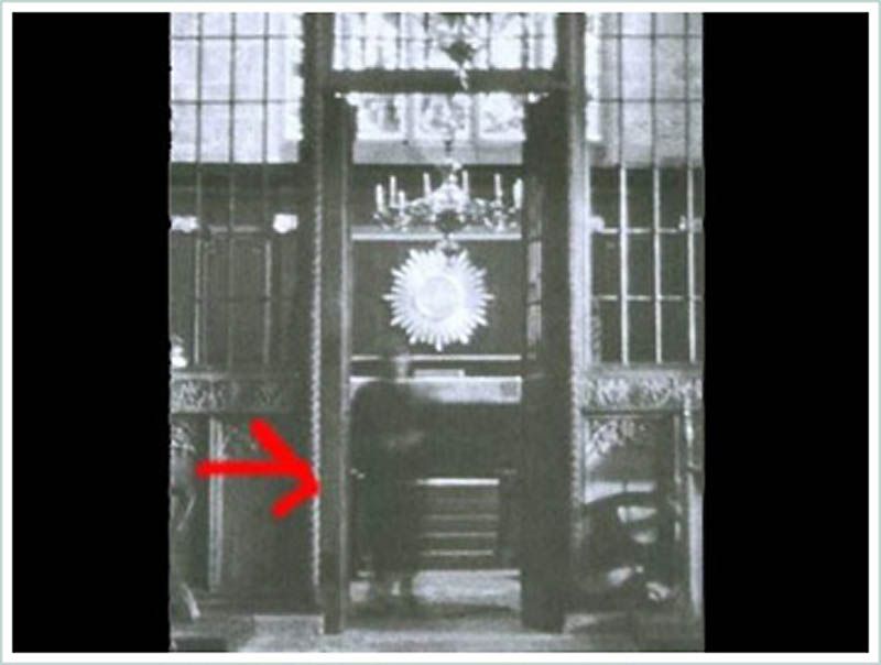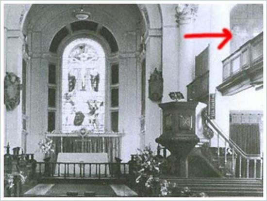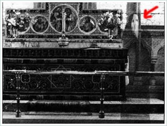 Этот снимок был сделан в 1963 году священником К.Ф. Лордом в церкви Ньюбай в Северном Йоркшире, Англия. Снимок вызвал бурю споров, так как призрачное лицо и направление взгляда дают основания говорить о накладке кадров. Но, говорят, что это фото было детально изучено экспертами, которые пришли к выводу что это не два кадра наложенных один на один, а именно один цельный снимок.