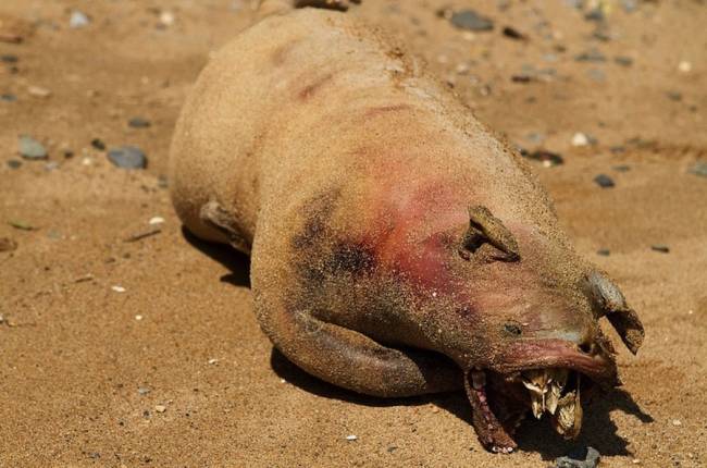 Труп загадочного животного обнаружился на одном из американских пляжей летом 2008-го года. Нашли тело четверо молодых людей, прогуливавшихся по пляжу Дитч недалеко от города Ист-Хэмптон, штат Нью-Йорк. Опознать вид животного им не удалось, и тогда, разумеется, дело было передано учёным. Те его, правда, тоже идентифицировать сразу не смогли. На теле совершенно не было волос, шкура была гладкой и толстой, а морда по форме не подходила ни одному обитающему в этих местах животному.