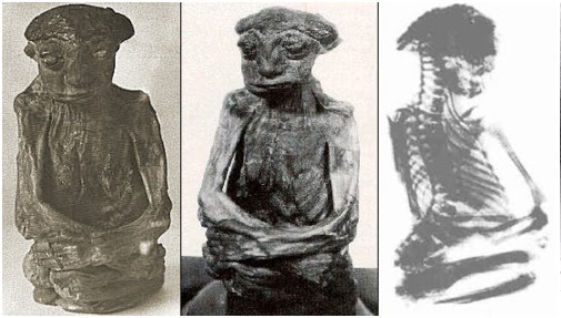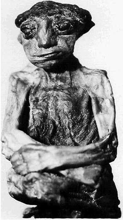 когда-то живым. Рост мумии не превышал 17 см в сидячем положении,