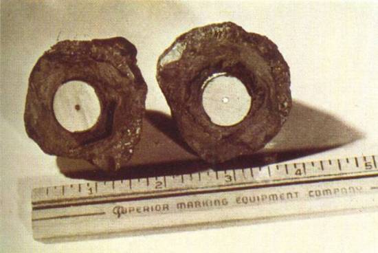 Внутри оказался некий предмет округлой формы из белой керамики, в центре которого располагался двухмиллиметровый металлический стержень, реагировавший на магнит. Сам же керамический цилиндр был размещен внутри шестиугольника из проржавевшей меди и каких-то еще неизвестных материалов. Искатели обратили внимание и на другие странные особенности камня: помимо того, что он был покрыт осколками раковин, затвердевшей глиной и галькой, еще большее удивление вызывали два не реагирующих на магнит металлических предмета, очень похожие на гвоздь и шайбу.