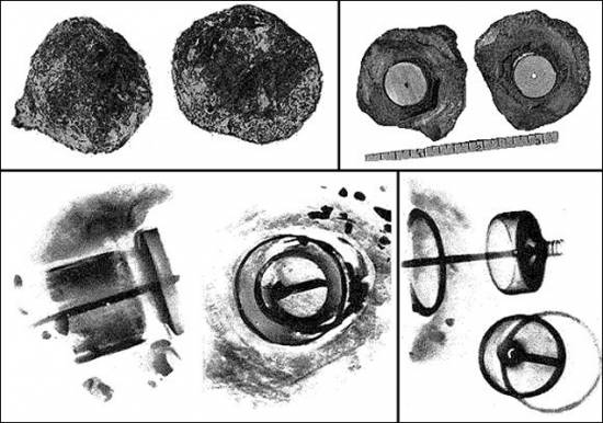 Единственным известным исследователем артефакта был ученый Рон Калаис. Ему разрешили сфотографировать окаменелости при обычном освещении и под рентгеновскими лучами. Они-то и показали, что внутри округлой сферы находится металлический стержень, который упирается в маленькую пружину. А все это напоминало некий электрический механизм. Но как он мог попасть в пласт породы эпохи каменного века?