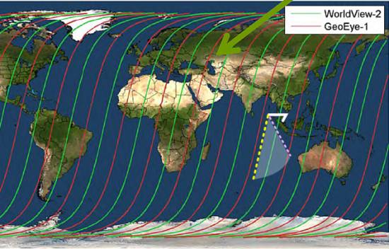 Спутники DG летают на высоте 680 и 770 км. Чтобы сделать качественный снимок, они используют оптику, которая охватывает одновременно квадрат со стороной 15 на 15 км и более. То, что находится за пределами этого квадрата, остается незамеченным.