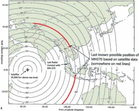 Тонкость здесь в том, что самолет отключался от связи с землей последовательно, с интервалом в четверть часа, а затем, примерно через час, был засечен военными радарами. Это исключает версию мгновенной гибели воздушного судна. Летел МН-370 на запад, то есть совсем в другую сторону, чем ему было положено. Последними данными от него были сигналы, полученные спутником связи Inmarsat, они не несли информации о координатах, но по анализу сигнала возникли две теоретические дуги его местонахождения: одна – над Азией, другая – над Индийским океаном. Больше никакой навигационной информации о самолете не было.