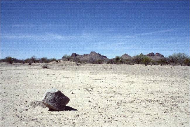 Пейзаж здесь поистине впечатляющий: ярко синее небо, почти всегда без облаков, и пустыня жёлтого цвета с ярким красноватым оттенком, где местами растут небольшие хиленькие кактусы. По краям зона огорожена небольшими горами сиреневого цвета. Когда-то давно на этой территории проживали люди. Они селились у водных источников. Но прошло время, источники высохли, и люди отсюда ушли, расселившись у подножия горы.