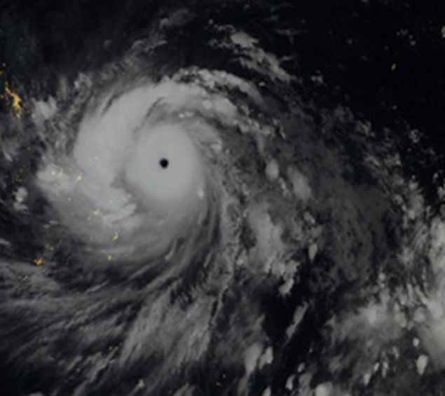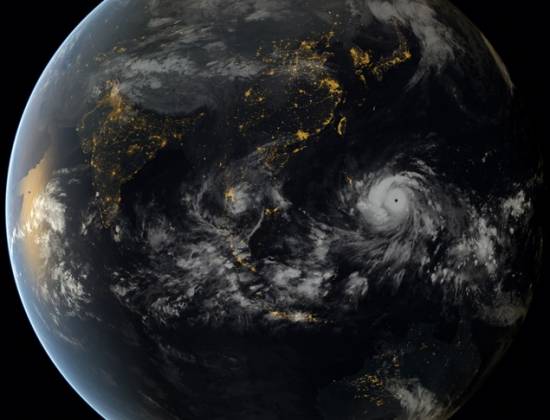 На снимках в инфракрасном диапазоне, сделанным 7 и 8 ноября, видно как катастрофически упала температура в центре гигантского облачного вихря. Разница с окружающим пространством составила более 100 градусов! Где-то — 37 градусов тепла, а внутри тайфуна — минус 63 градуса по Цельсию. Сам же вихрь достиг циклопических размеров. Из космоса он выглядит просто захватывающе.