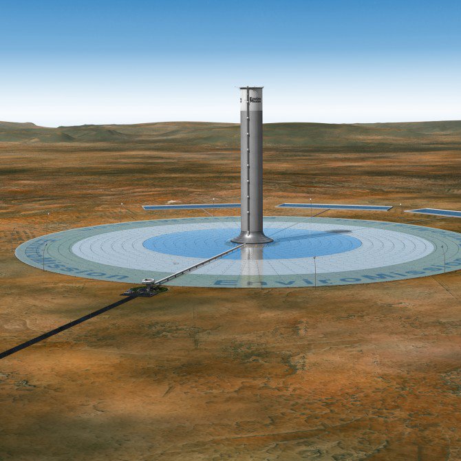 В основании огромной солнечной башни будет размещено сразу 120 очень больших турбин, а также высокопроизводительные насосы, предназначенные для перегона более 11 миллиардов литров циркулирующей воды. После сдачи в эксплуатацию солнечная башня в пустыне будет иметь огромную выходную мощность, которую можно сопоставить с энергией высокопроизводительной ГЭС или ветровых турбин, которые установлены на площади 40 тысяч га.