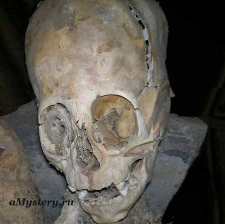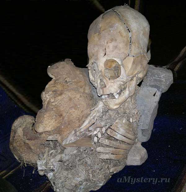 В Перу в городе Andahuaylillas были найдены останки двух гуманоидов, останки одного из них сохранились достаточно хорошо. У мумии большой удлиненный череп странной для человека формы. Размеры черепа почти такие же, как и размеры остального тела – 50 см. У черепа осталось мягкое место - несросшийся родничок как у новорожденного младенца и большие коренные зубы как у человека в зрелом возрасте.