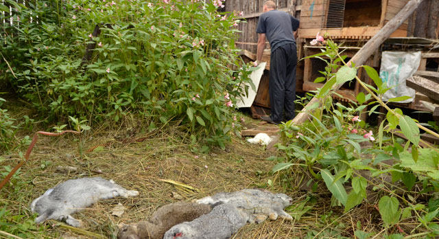 На дальних клетках (их больше десятка) — следы когтей и челюстей, буквально «с мясом» выдраны все металлические дверцы, а на подходах — настоящее кроличье побоище: десятки пушистых трупиков с отгрызенными мордочками, лапками или практически целых (видимо, только задушенных) разбросаны по всему огороду. В загоне для уток та же страшная картина.