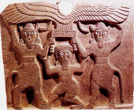 Гильгамеш в окружении быкоподобных людей поддерживает крылатый диск - символ ассирийского бога Ашшура