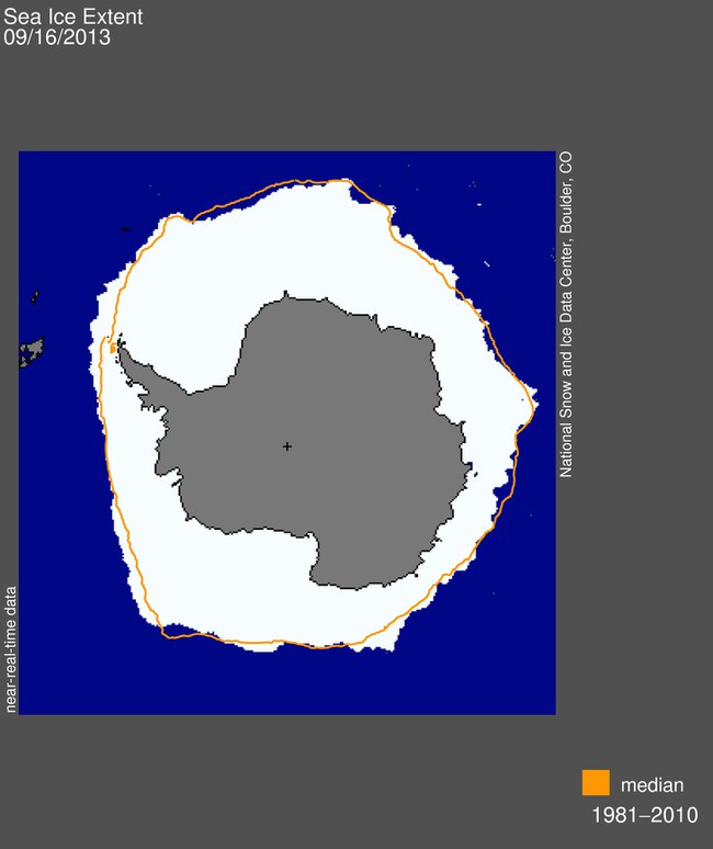 Rugsėjis į Antarktidą atneša poliarinės žiemos pabaigą, tačiau Bolderyje (Koloradas, JAV) esančio Nacionalinio sniego ir ledo duomenų centro (National Snow & Ice Data Center, NSIDC) pranešimai byloja, kad tebeaugantis ledo, esančio tik jūroje, kiekis aplink Antarktidą pagerino absoliutų visų laikų pietų poliaus ledo ploto rekordą. Nors paskutinį kartą toks rekordas buvo pasiektas pernai, 2012 m. rugsėjį. Tada maksimalus ledo plotas siekė 19,44 mln. kvadratinių kilometrų. Šiemet, rugsėjo 14 d., pietų ašigalį dengiančios ledo kepurės plotas siekė jau 19,51 mln. kvadratinių kilometrų.